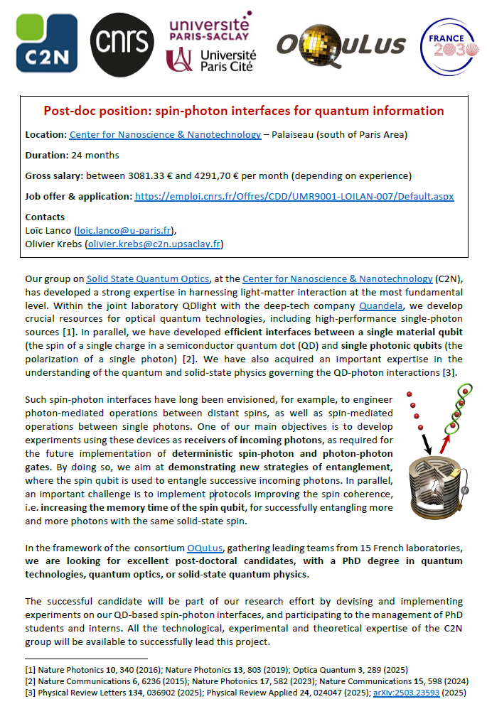 We are seeking a Post-doc with a PhD degree in quantum technologies, quantum optics, or solid-state quantum physics to join our efforts on using quantum dot devices (developed in collaboration with Quandela) as receivers of photons to mediate spin-photon and photon-photon gates deterministically. (for more context, see flier).