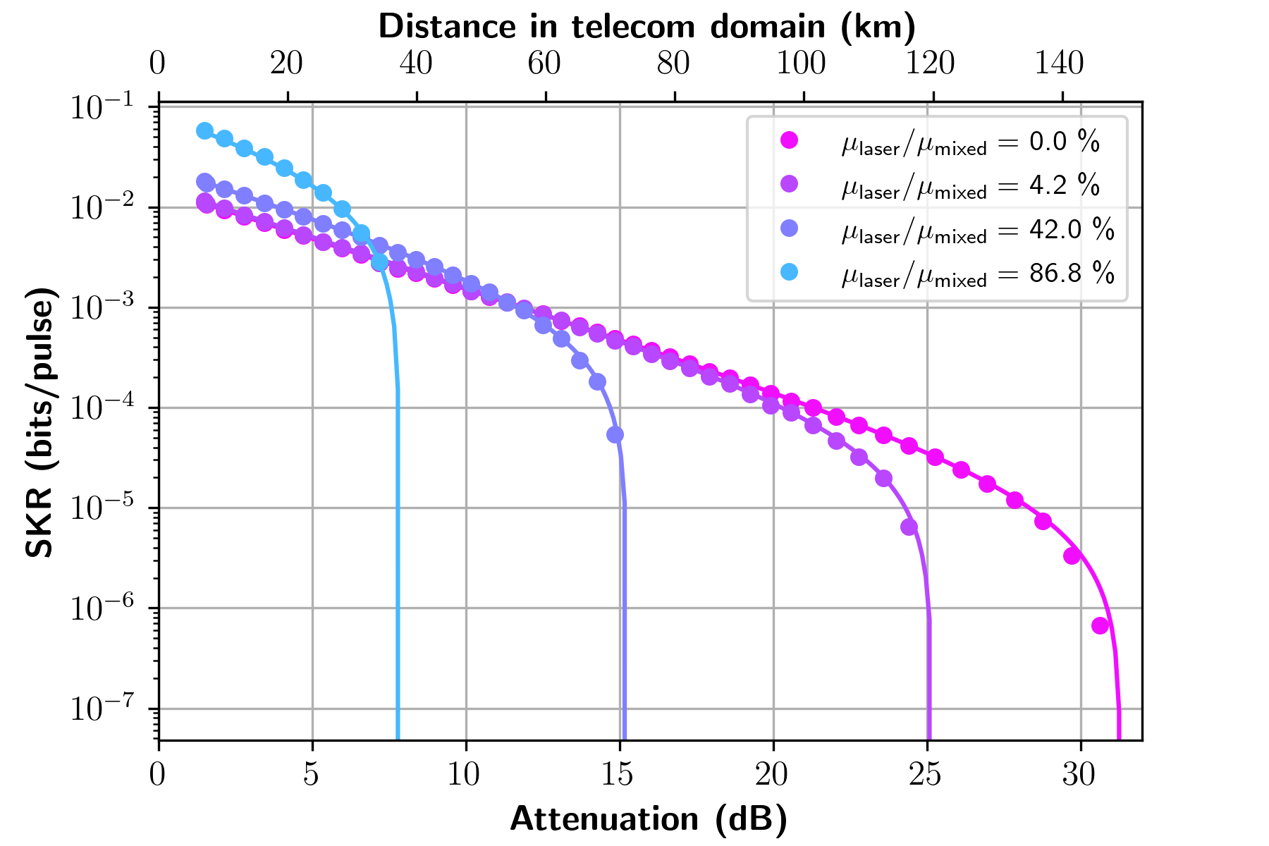 Distance scaling of the secret key rate obtained with different hybrid statistics. Secret key rate is the basic figure of merit for QKD protocols, indicating the amount of bits shared by Alice and Bob that can be used in a final key per unit of time.